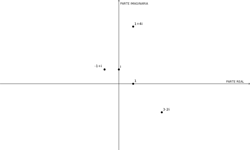. Al tener dos coordenadas, podemos representarlo en el plano. Aquí tenemos algunos ejemplos de números complejos representados en el plano: